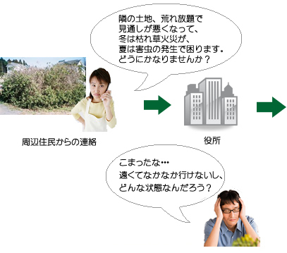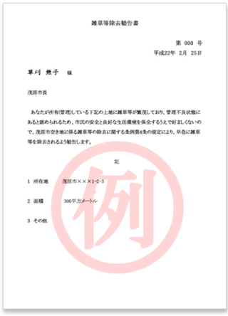右のような、雑草除去勧告書、雑草除去命令書が届いてお困りの方はいらっしゃいませんか? 所有者が管理しないまま放置した土地に、雑草が茂ったり虫が発生するなど、周辺住民から役所に苦情が寄せられているような場合に、このような書類が送られてきます。